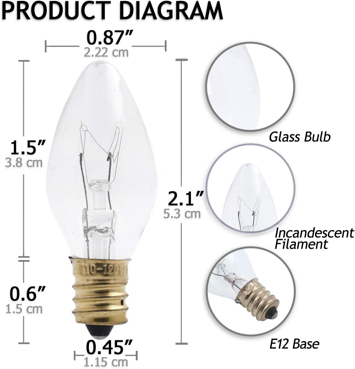 Bulk clear night light bulbs; Incandescent 7w c7 night light bulb e12 candelabra base mini light bulbs with 360-degree illumination; E12 night light bulb & salt rock lamp bulb with 1500 hours life span; 45 Lumen 110v 120v 7w bulb; 2800k soft warm night light bulb