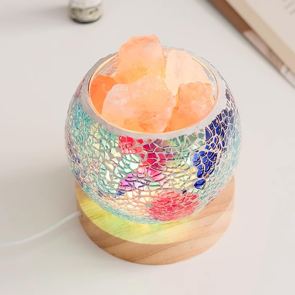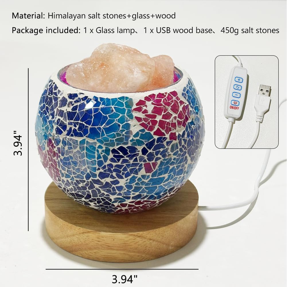 MATERIAL & SIZE: This salt lamp is constructed from mosaic glass bowl, solid wooden base and natural Himalayan salt stones. With a size of 3.94 inches/10 cm in diameter and 3.94 inches/10 cm in height. Each stone varies slightly in size and color, so the actual product may differ from the pictures