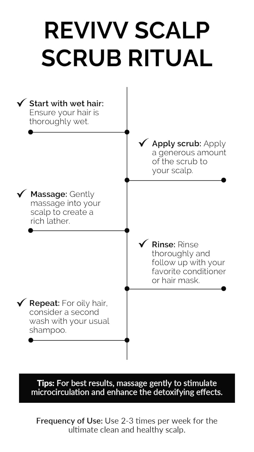 EXFOLIATE & DETOXIFY: REVIVV Scalp Scrub Shampoo is the ultimate scalp exfoliator, combining Himalayan pink salt with plant-based oils to deeply cleanse and detox your scalp, leaving it refreshed and balanced.