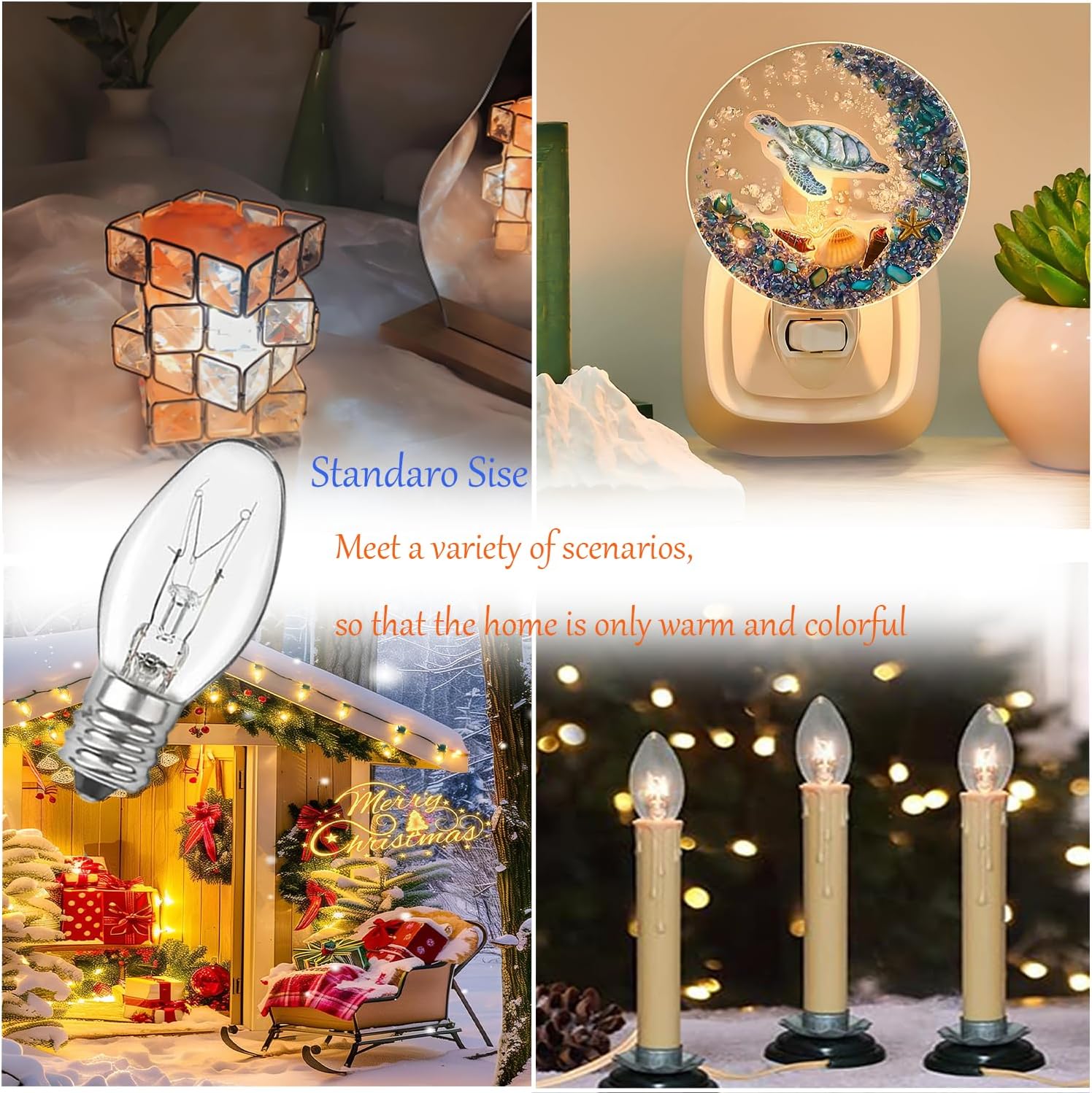 Classic & Beautiful Light Source: Our e12 c7 wax warmer bulbs use high transparency glass, the light is uniform and soft, taking care of both eyes, providing comfortable illumination with a color rendering index (CRI) of 90+. This high CRI ensures that all objects display their natural colors, making them appear more vibrant. The bulbs are flicker-free and do not emit UV or IR radiation, effectively protecting your eyes and those of your family