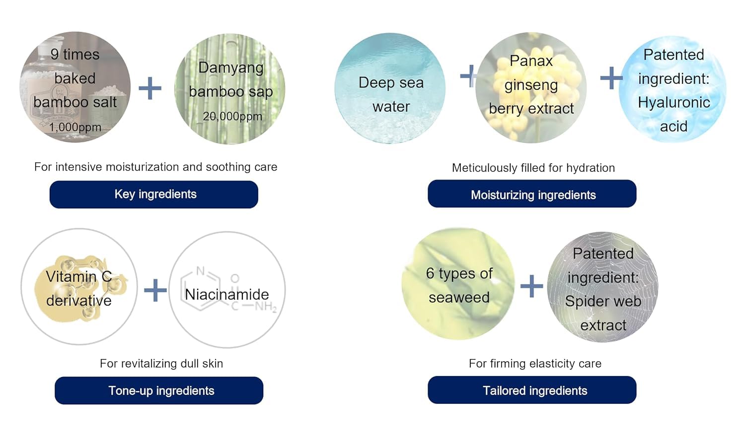 Deep Ocean water, Panax Ginseng Berry extract, Hyaluronic acid for Moisturizing.