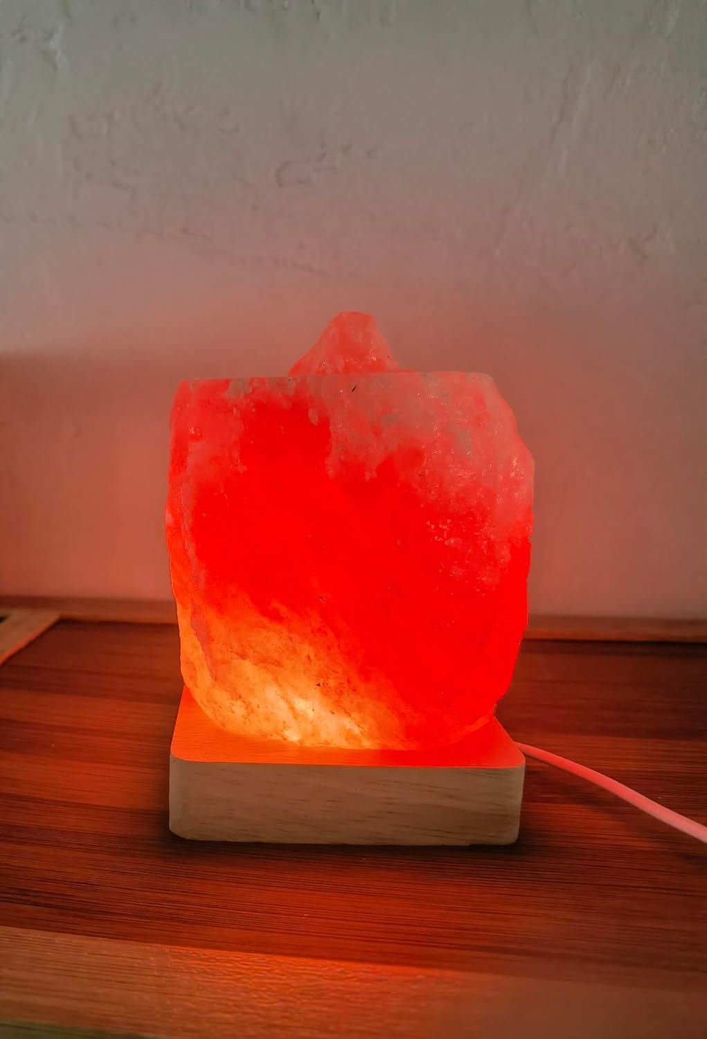 The base of the salt stone lamp has a USB cable and multiple LED lights. Just plug in the USB port, and the light on the base will light up,Product size: 9×9.5×10.5cm, Weight: Approximately 1200 grams.