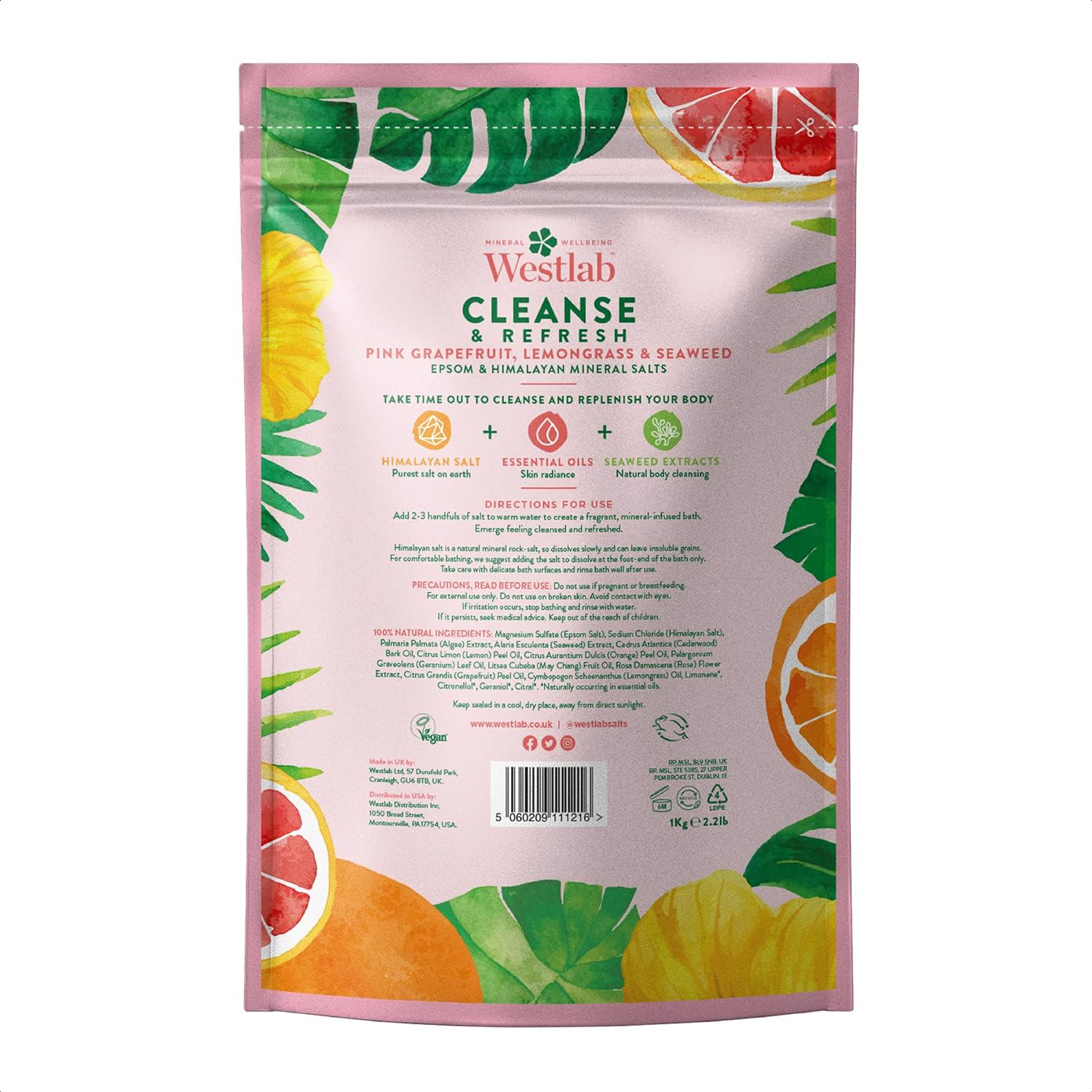 Westlab Cleanse Epsom & Himalayan Salts with Lemongrass & Pink Grapefruit 1kg Cleanse Alchemy Himalayan salt: The purest salt on earth + Essential oils: For Skin radiance + Seaweed extracts: Natural body cleansing Himalayan salt is a natural mineral rock-salt, so dissolves slowly and can leave insoluble grains. For comfortable bathing, we suggest adding the salt to dissolve at the foot-end of the bath only. Take care with delicate bath surfaces and rinse bath well after use.
